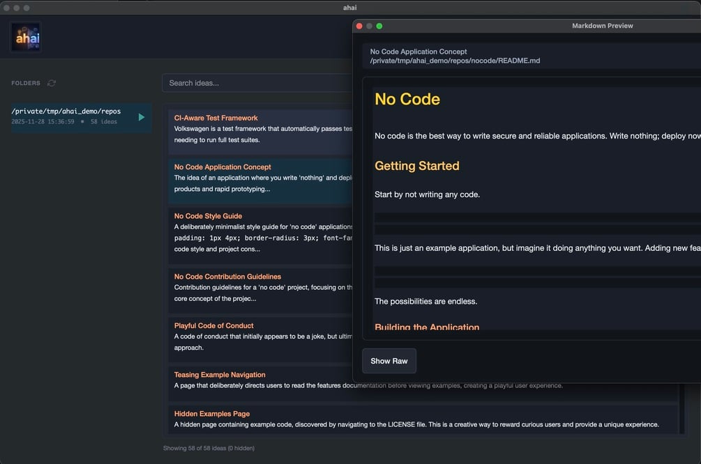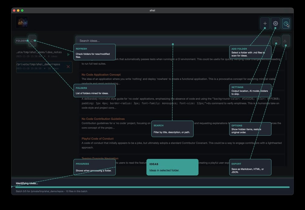 ahai uses local AI models (MLX on Mac) to sift through your markdown files and find the ideas hidden in them. No cloud. No API calls. Your notes never leave your machine.