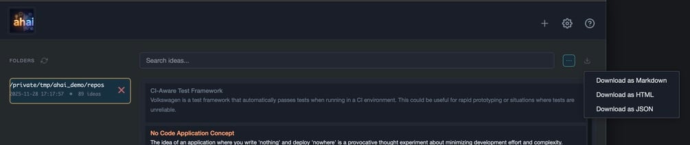 - Export to JSON, CSV, or Markdown — take your ideas anywhere